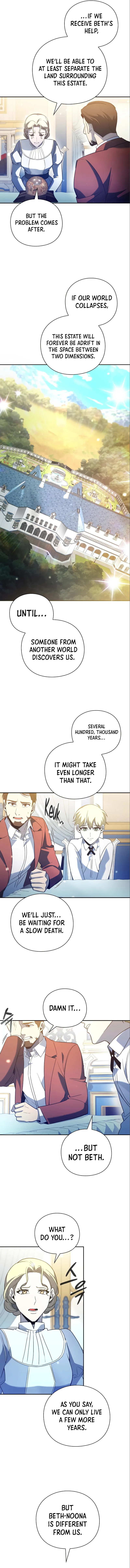Beth learns her family sacrificed their consciousness by becoming dolls to protect her, intending to wait for someone from another world to save her. Elizabeth Bathory, a powerful vampire, is now a cat familiar to the protagonist, and her abilities are limited. The protagonist challenges Beth's perspective on her family's actions, revealing they are more like programmed dolls than conscious beings, and also learns about a impending dimensional collision and that separating the estate might offer survival.