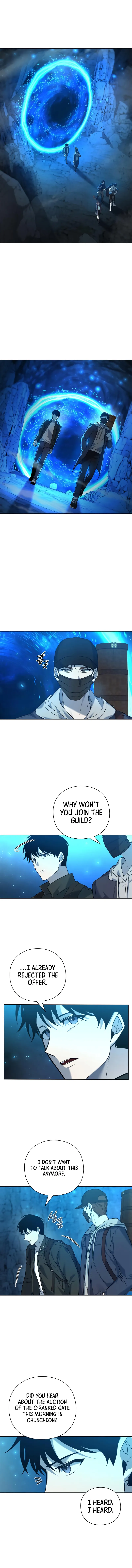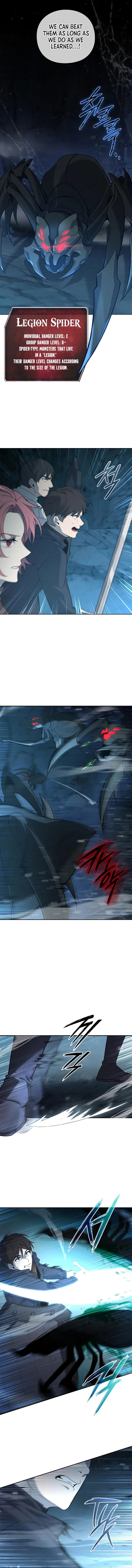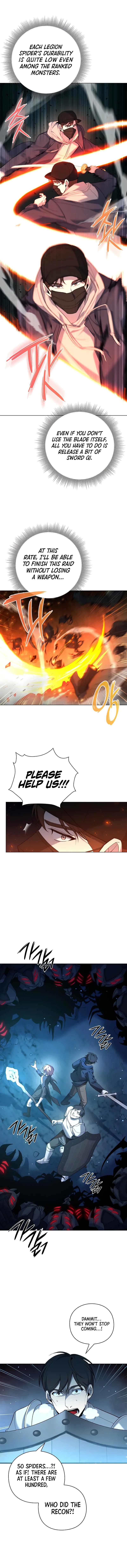 The chapter begins with the main character, Joonseoh, preparing for a dungeon raid, facing a large group of 'Legion Spiders'. He plans to use his sword-based abilities despite mana limitations and a warning about his reckless sword qi use. Meanwhile, there's a side conversation about guild privileges, including gate purchases. Joonseoh has previously rejected the powerful Overkill guild due to trauma linked to the 'Dawon Guild' annihilation. He proceeds into the dungeon knowing that he needs to fight without relying on help.