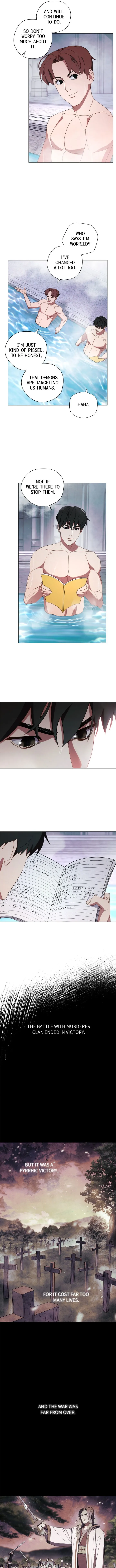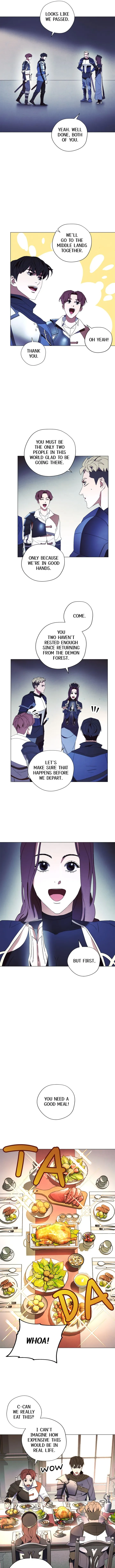 Yoonjae and his companion successfully complete a difficult trial, impressing observers with their progress and are rewarded with a feast before heading to the dangerous Middle Lands. They discuss recent events involving demons, including a past encounter, and their determination to fight back.