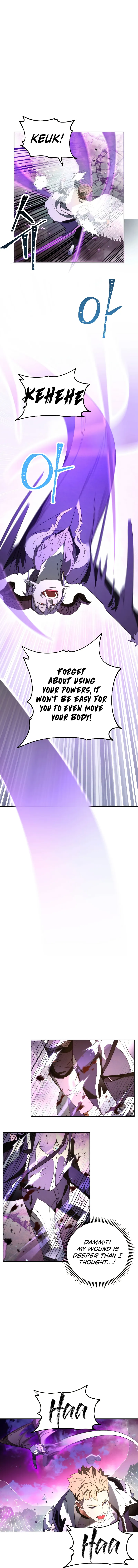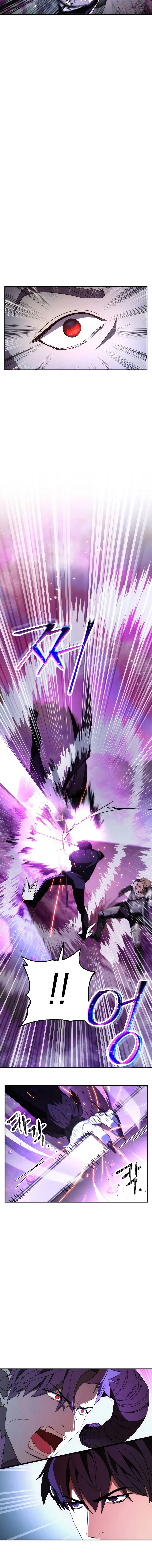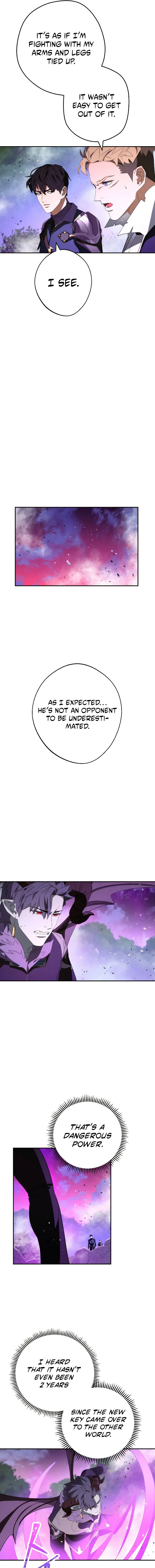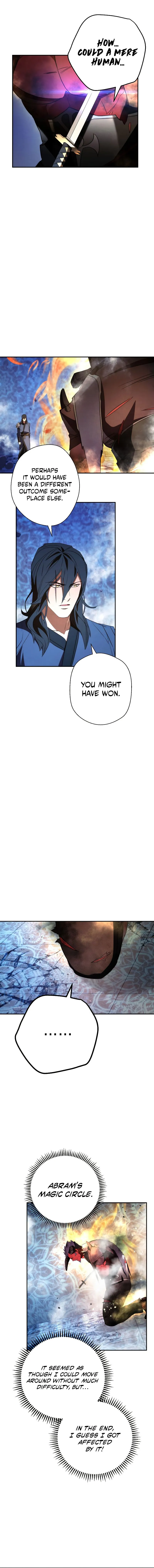 The chapter opens with a demon king being defeated by a human, an event considered impossible. The human, although wounded, displays incredible endurance and the ability to suppress a vast magic power. Observing characters acknowledge his dangerous power and control, noting his progress is faster than expected. The chapter concludes with the human healing briefly and preparing for further conflict using a mysterious ability.