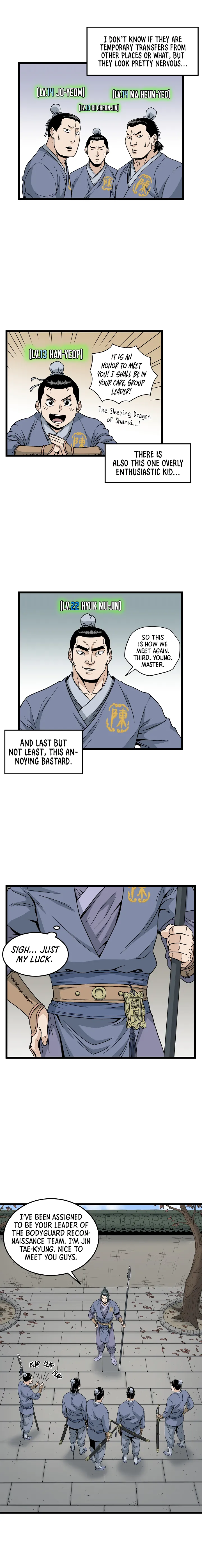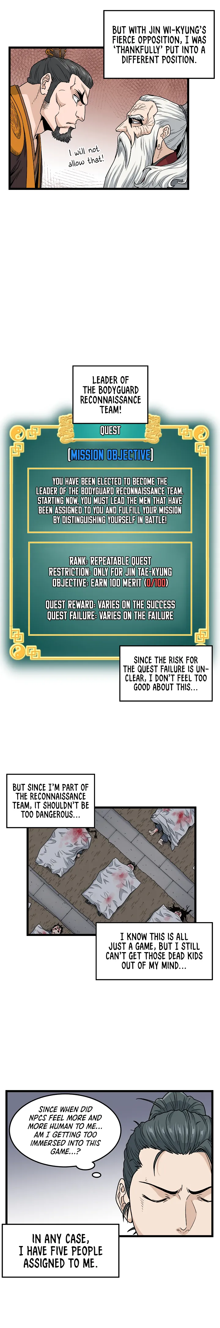 The chapter sees Jin Tae-kyung unexpectedly made leader of a bodyguard reconnaissance team, a position he reluctantly accepts while grappling with the game's increasing realism and the deaths of previous characters. Meanwhile, news arrives that a formidable force led by 'One Word, One Kill' Jo-Pil is rapidly approaching Taiyuan, causing concern among the Jin family. A tense meeting reveals the family's awareness of potential attacks and assigns the protagonist to the frontlines, despite his apparent ailment, setting the stage for an impending battle.