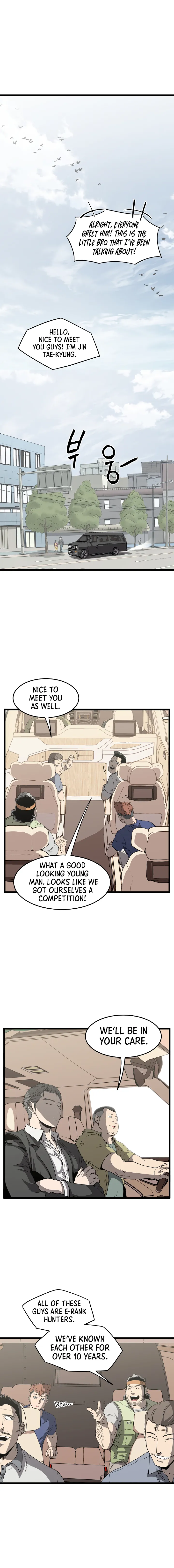 Jin Tae-kyung is introduced to a group of veteran E-rank hunters and learns he's been hired as a 'carrier' for an E-rank gate mission due to a recommendation. The chapter also establishes that gates are remnants of a past demonic invasion and a source of income for hunters, as magical gear is necessary inside. It ends with a reveal that the group is part of a new guild, with only three members including Jin.