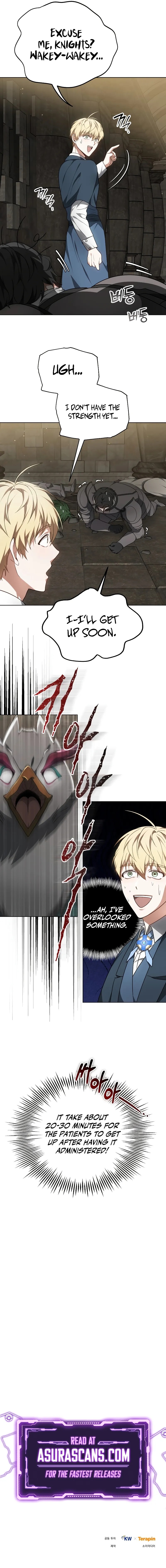 The chapter begins with the knights collapsing, leaving the healers and protagonist in a panic. It's initially hypothesized to be poison or a curse, but it's quickly discovered to be a severe allergic reaction. The protagonist, having prepared for this exact scenario, uses epinephrine to revive the fallen knights, revealing the beast's use of hypersensitive substances that induce anaphylactic shock. The chapter concludes with the protagonist having successfully saved the knights and the knights vowing to capture the beast.