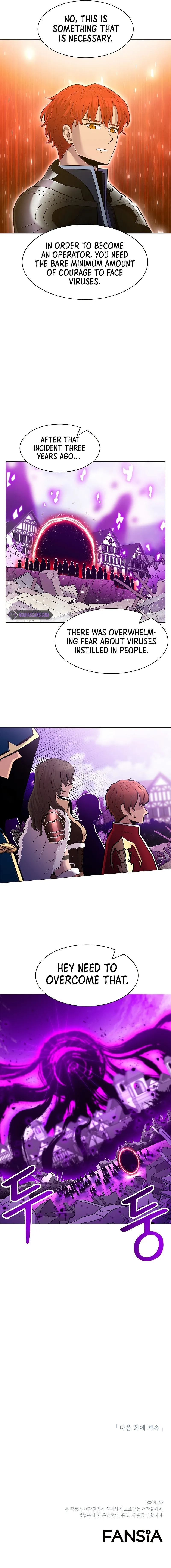 The chapter begins with a display of Mia's rare anger, protecting her 'Unnie' from rude applicants. Then, Isaac, the new moderator, unveils his selection process for new operators. He outlines a challenging test where they must recapture Vansen, a city overrun by viruses, despite their lack of experience. While some applicants voice fear and doubt about the test, Isaac assures their safety while emphasizing the need for courage in the face of viruses. The applicants are equipped with special weapons and will be watched by current operators.